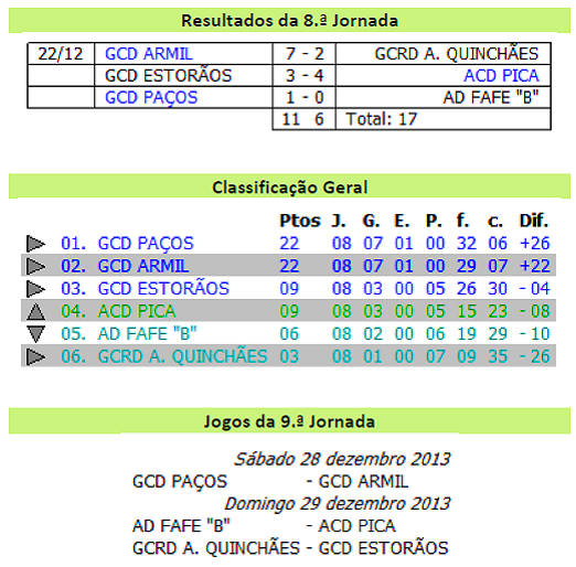 Depois deste jogo o Fafe continua uma posição à frente do Antime, com mais um ponto, com oito e sete pontos respectivamente. A melhor equipa fafense neste escalão é a do Ases de S. Jorge com 18 pontos, ocupando o terceiro lugar com menos um ponto que o 2.º Vitória de Guimarães e menos quatro que o primeiro Vizela, equipa que tem mais um jogo que os fafenses. Quem também está a fazer um bom campeonato é o Arões que segue em 4.º com 13 pontos. Já a outra equipa fafense deste escalão, o GD Fornelos, ocupa o décimo lugar, logo a seguir ao Antime, com sete pontos.